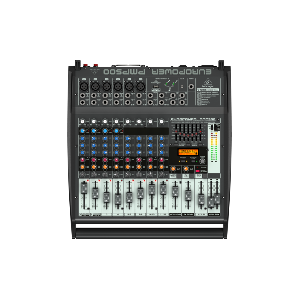 Behringer PMP500 Пульт микшерный (4 моновхода, 4 стереовхода, 6 микрофонных предусилителей) со встроенным усилителем мощности RMS 2 х 250Вт/ 4 Ом, мастер-эквалайзером, процессором эффектов Klark Teknik, порт для подключения беспроводного радиомикрофона