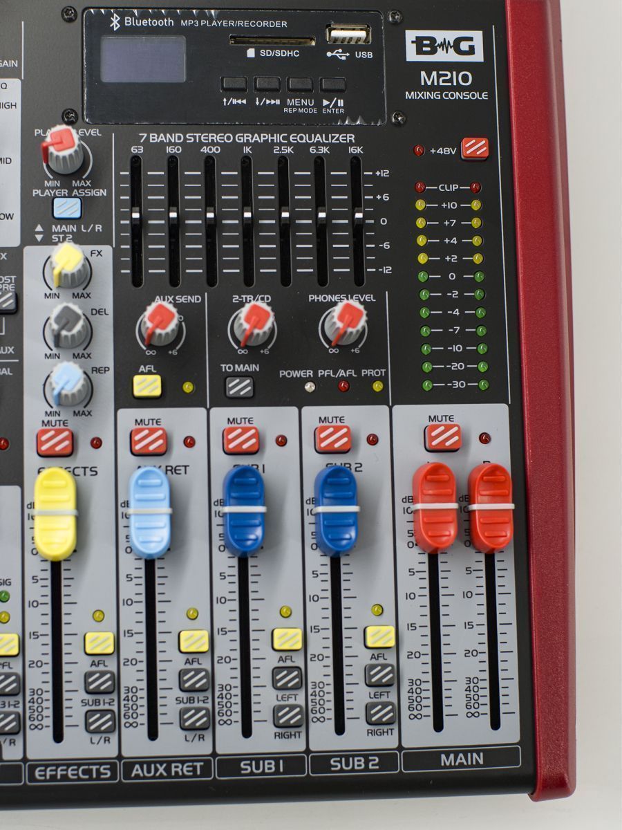 BG M210 Пульт микшерный, 8 моно, 2 стерео, USB/SD MP3 плеер, процессор эффектов, 7 полосный эквалайзер, 2 подгруппы, фантомное питание