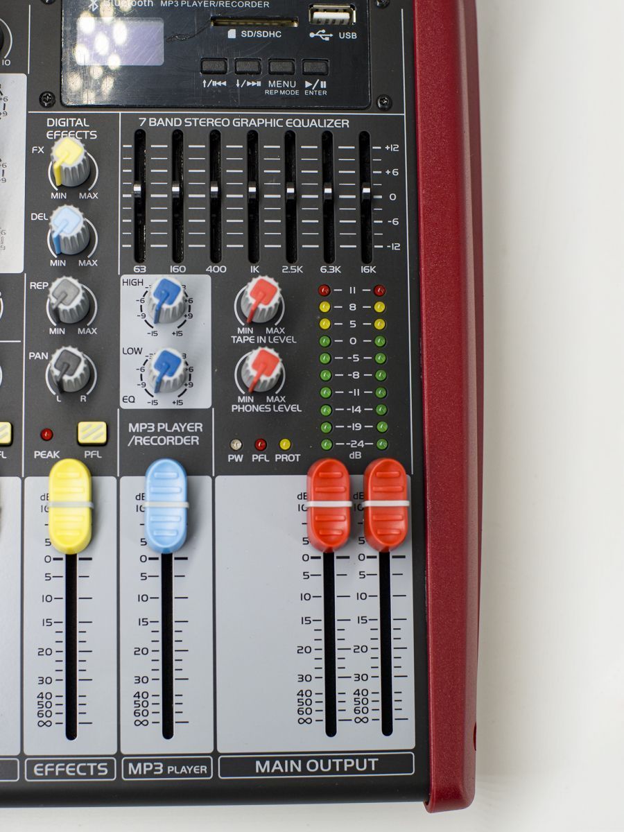 Пульт микшерный, 6 моно, 1 стерео, процессор эффектов, USB MP3, BT, 2 полосный эквалайзер