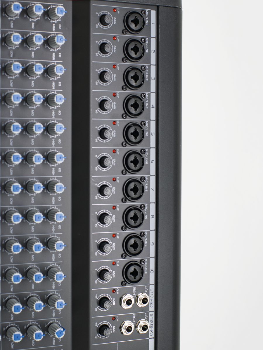 Описание модели: пульт микшерный Количество каналов: 14 Моно входы: 10 Стерео входы: 2 Моно канал: балансный XLR, 2 pin hot, 2 кОм, чувствительность -60 ~ +14 дБн; TRS балансный, tip hot, 10 кОм, чувствительность -40 ~ + 14 дБн; XLR, фантом +48В Стерео канал: TRS балансный, tip hot, 10 кОм, чувствительность -40 ~ + 14 дБн Максимальный входной уровень, дБн: MIC +24, Line +24, Other Line +20 Максимальный выходной уровень, дБн: XLR +26, TRS +20 Подключение по USB: есть Master метры: 12 сегмент -30дБ до CLIP Метры каналов: 1 индикатор сигнала Частотный отклик, Гц: <20 – 30000 (0.5дБ) Искажения (THD+N): <0.01% (Канал для микширования) Перекрестные помехи на частоте 1 кГц, дБ: отключение фэйдера > 85, отключение звука > 85, Inter канал > 82 Эквалайзеры моно каналов, дБ: HF +/- 15дБ, 12кГц, MF +/- 15дБ, 2.5кГц, LF +/- 15дБ, 80Гц Эквалайзеры стерео каналов: HF +/- 15дБ, 12кГц, MF +/- 15дБ, 2.5кГц, LF +/- 15дБ, 80Гц Выход L/R: XLR балансный, pin 2 hot, < 75 кОм. +4дБн, макс. +22дБн Выход FX/AUX: TRS небалансн