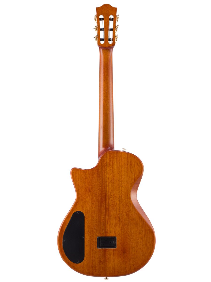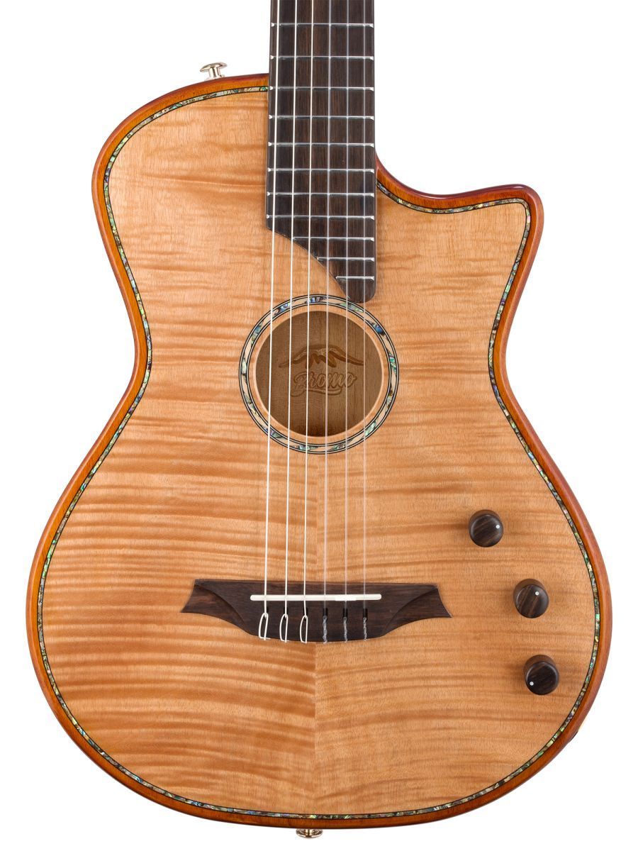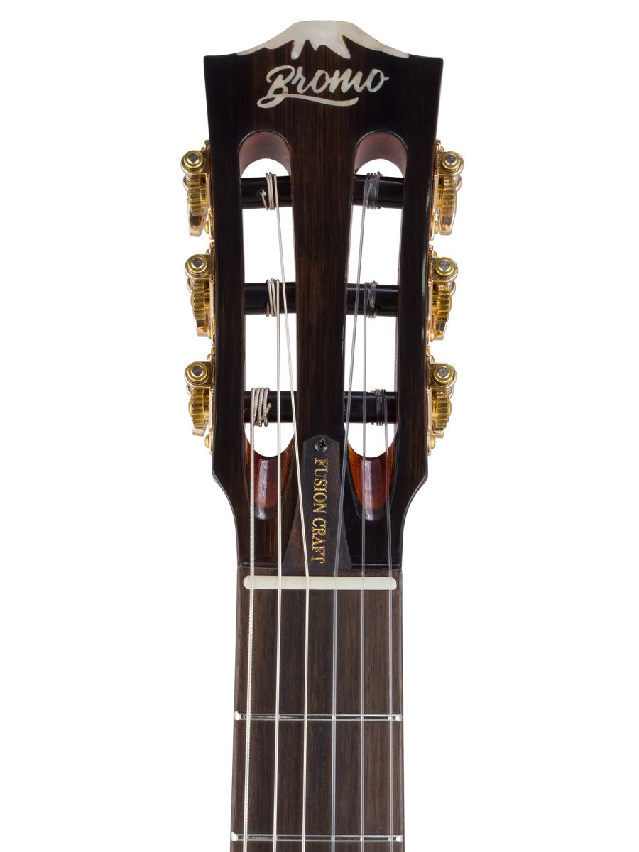 Bromo BEN2C Гитара полуакустическая с нейлоновыми струнами, корпус: махагони, верхняя дека: ель с шпоном из огненного окуме класса 5A, гриф: махагони, накладка грифа: макассарский эбен, двухсторонний анкер, колки: винтажные, «Mt. Bromo» позолоченные, электроника: пьезодатчик + 3-позиционный звукосниматель под струнодержателем, глянцевый лак, цвет: Natural, в утепленном жестком кейсе