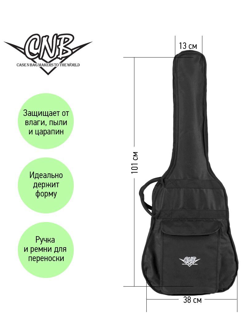CNB CB400 – это стильный и качественный чехол для классической гитары. Главное назначение модели CNB CB400 – оберегать инструмент от внешних воздействий окружающей среды, которые негативно сказываются как на внешнем виде гитары, так и на ее звучании. Чехол изготовлен из водонепроницаемого нейлона с плотностью 600 D. Защитное уплотнение толщиной 7 мм предотвращает появление царапин и потертостей на инструменте. Чехол закрывается на прочную молнию с крепкими зипперами. Модель имеет большой наружный карман для хранения нот и гитарных аксессуаров. Заплечный ремень позволяет с удобством переносить гитару за спиной. Для транспортировки инструмента в горизонтальном положении имеются две прочные боковые ручки. Модель CNB CB400 выполнена в черном цвете, однако классический дизайн прекрасно дополняет логотип компании, расположенный на кармане. Чехол CNB CB400 создан не только для надежной защиты инструмента, но и для вашего комфорта.
