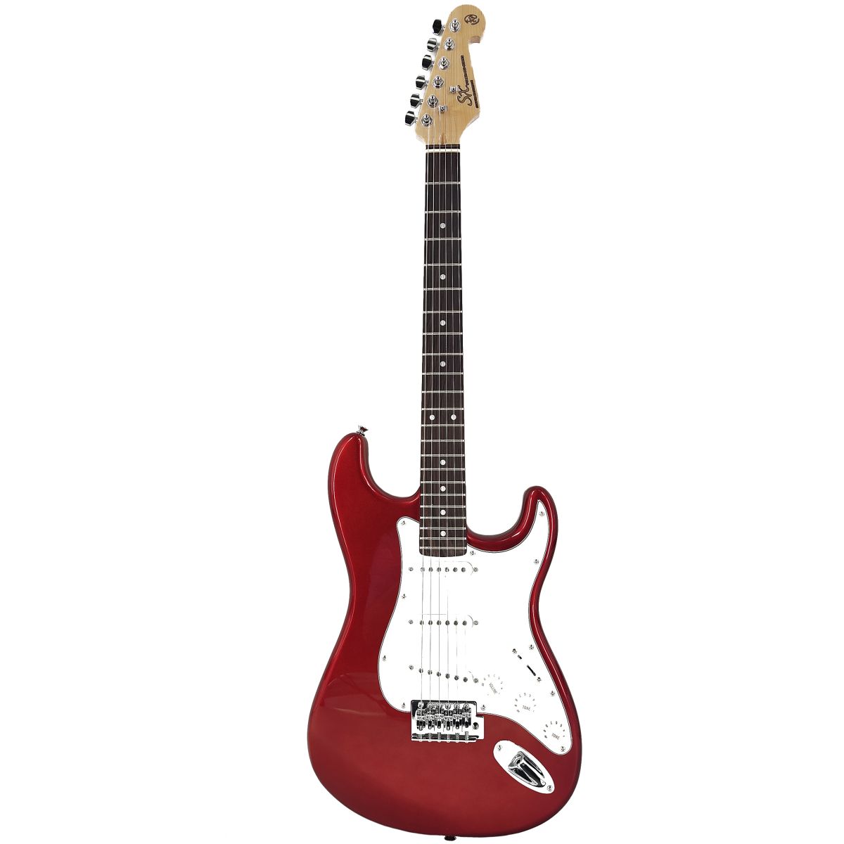 SX SE1-SK/CAR Набор: электрогитара, корпус: липа, гриф: клен, накладка: палисандр, анкер, 22 лада, звукосниматели 3 Single Coil, контроллеры: 1 громкость, 2 тона, 5 позиционный переключатель, цвет: Candy Apple Red, комбо 10Вт, кабель, ремень, тюнер, 6 медиаторов, чехол